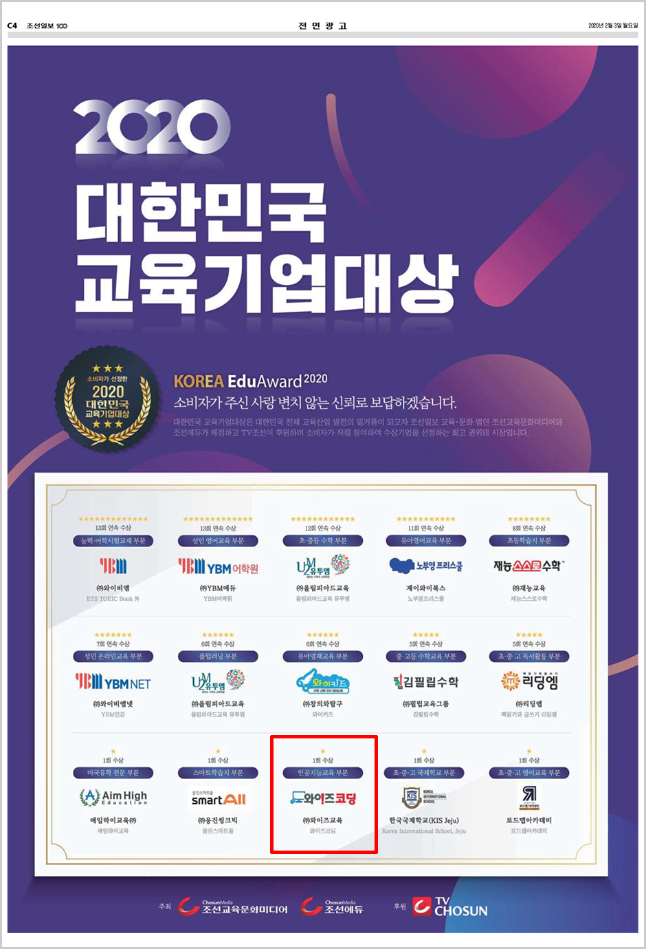 ¼ÒºñÀÚ°¡ ¼±Á¤ÇÑ 2020 ´ëÇѹα¹ ±³À°±â¾÷´ë»ó [ÀΰøÁö´É ±³À° ºÎ¹®] ¼ö»ó